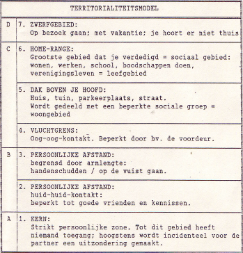 Door steeds weer op onderzoek uit te gaan en ervaringen op te doen, ontwikkelt iedereen voor zichzelf een ruimte, waarin hij functioneren kan. De ontwikkeling leidt tot zowel het innemen van een reële ruimte, als tot het vormen van een psychische ruimte. Vanuit de ethologie is een model bekend van de indeling van reële ruimte, die ieder individu nodig heeft. Deze indeling staat weergegeven in het Territorialiteitsmodel, zoals dit voor mensen geldt.